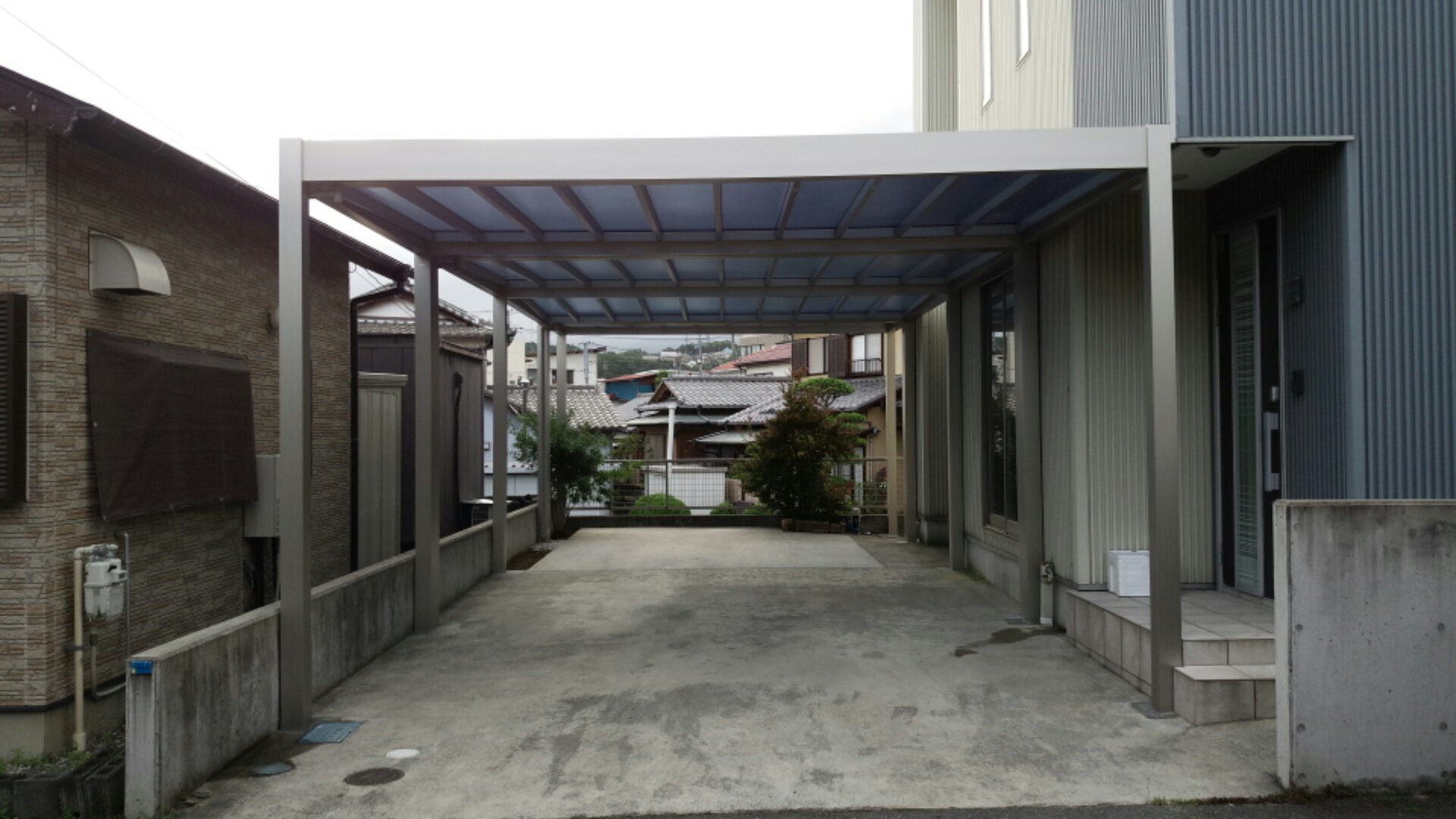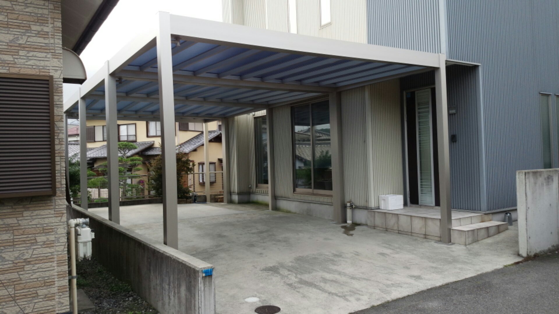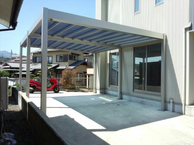 YKKAPのリレーリアとゆうカーポートなのですが、地形や建物に合わせ自由にカスタマイズできる見た目スタイリッシュなカーポートで今回は、既存のカーポートの前後に新たに同じカーポートを連結とゆう形でカーポートを延長しました。