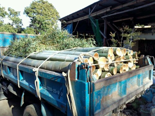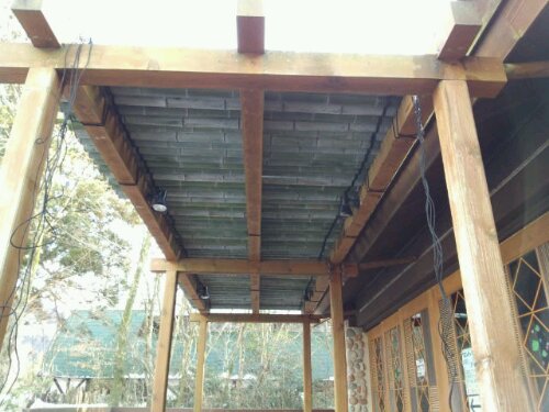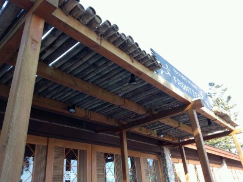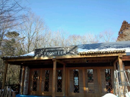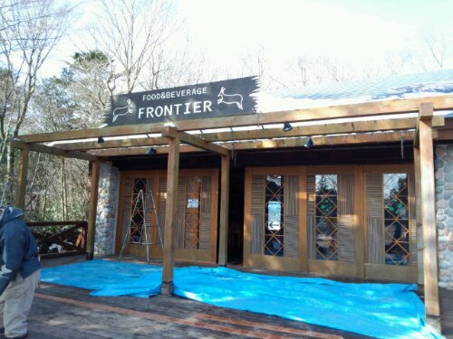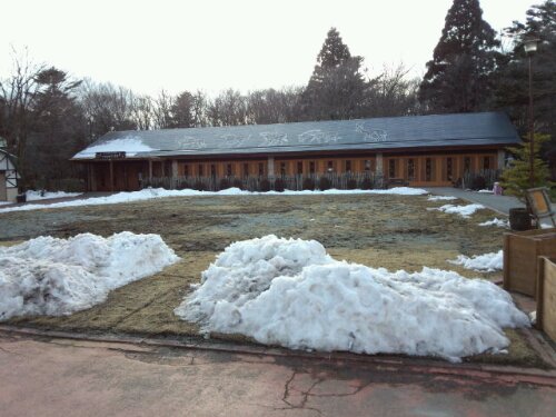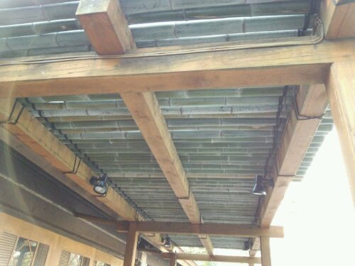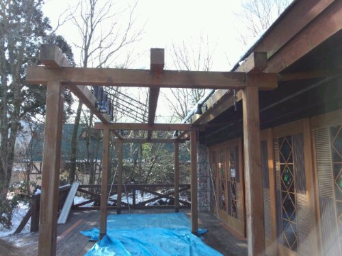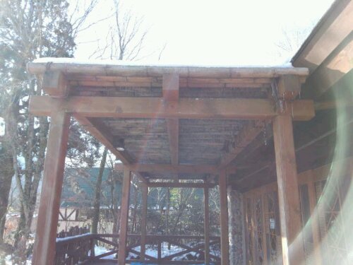 今日は、富士サファリパーク内にあるレストラン『FRONTIER』のテラスの屋根の取り替え工事でした。先週降った雪がまだ残っていました。 着手前。屋根は、竹をそのまま乗せ縄で編み込んであります。屋根にも雪が積もったままでした。 前日に新しく取り替える竹を切りました。 古い竹の取り外し完了。 新しい竹に取り替えました。 完成までもう少しです。
