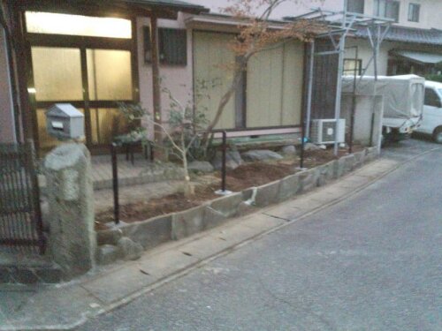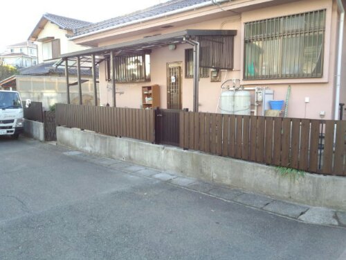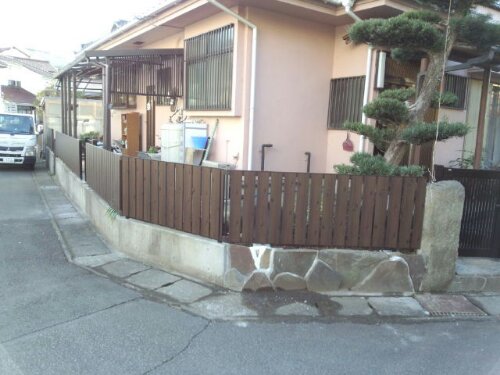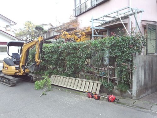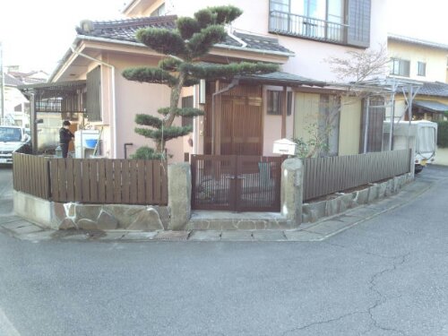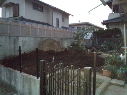 去年の11月下旬~12月にかけて三島市AI様邸にて、お庭の解体工事とフェンス,門扉設置工事をおこないました。 作業前。 お庭には、池や大きな景石,水鉢がありクレーン車を頼んでの解体となりました。植木も色々植わっていましたが9割がた伐採,伐根しました。 作業中。 お庭の解体工事は終わり、擁壁の上にフェンスの柱を立て終わった状況です。 作業終了。 フェンスは、木目調のフェンスで落ち着いた雰囲気になりました。