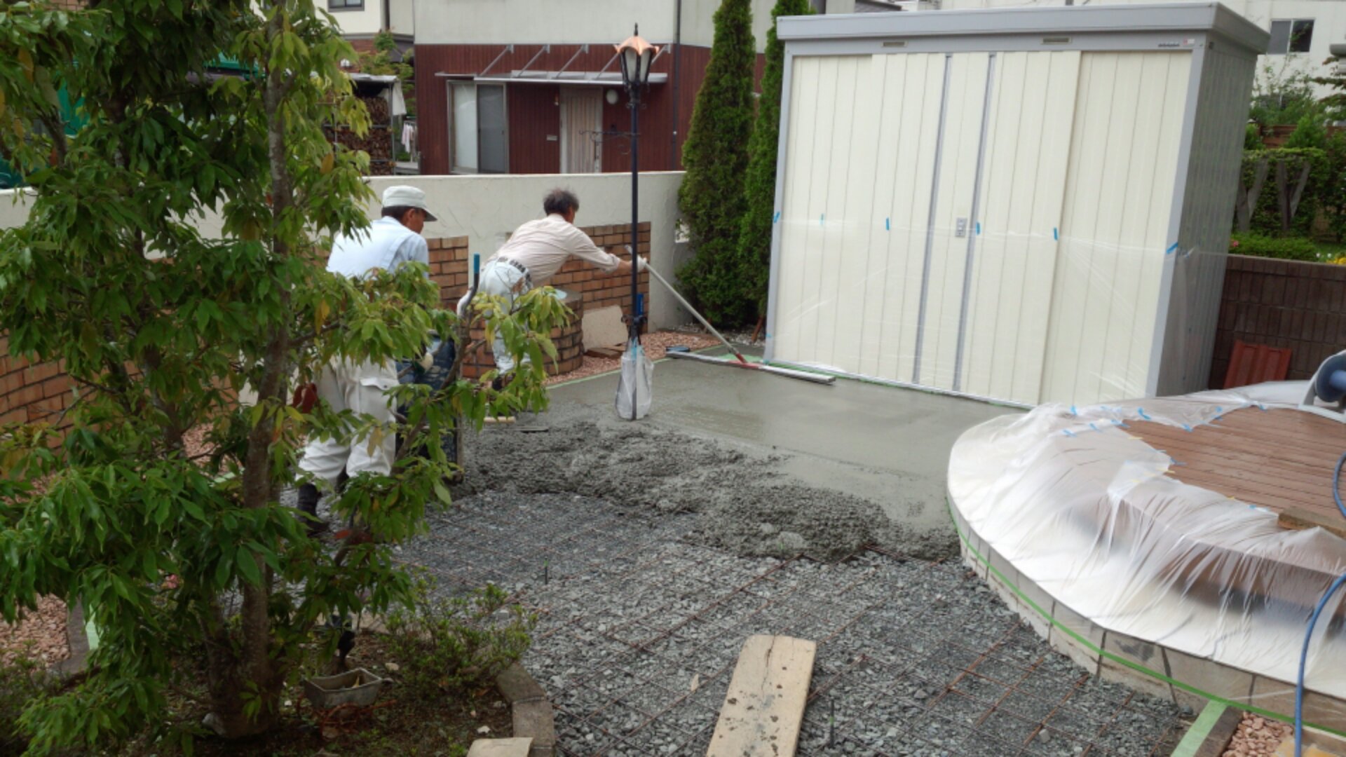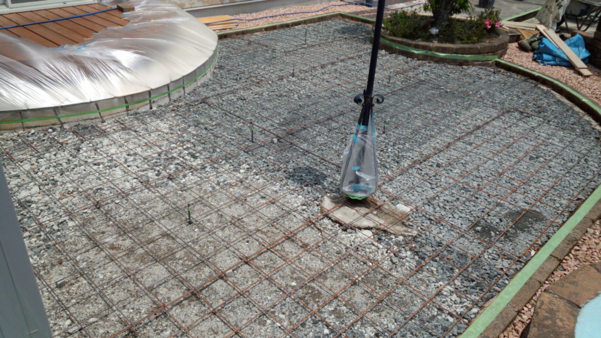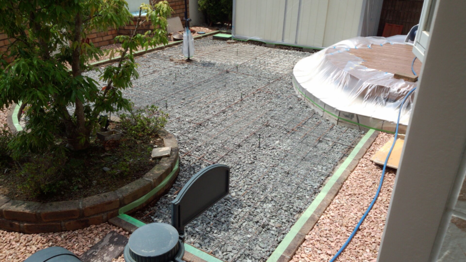 御殿場市にてコンクリート土間打をおこないました。 作業前。芝が張ってありました。 作業中。芝を剥がしていきます。 床堀をし、砕石敷き完了。 ワイヤーメッシュを敷きました。 生コンを流し、平にならしていきます。 完成。今回は、表面は金ゴテ仕上げでツヤツヤに仕上げました。