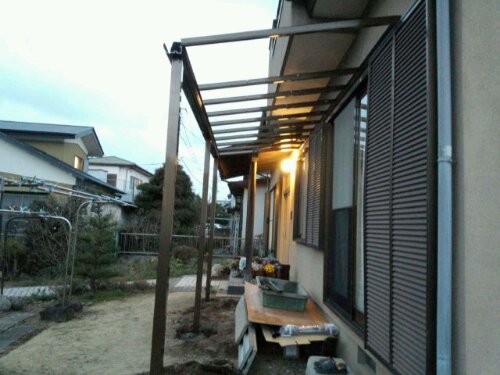 強風対策のため、通常のテラスと比べて垂木(建物から柱側に向かってついてる部材)を倍つける仕様になっています。明日は、屋根を取り付けていきます。
