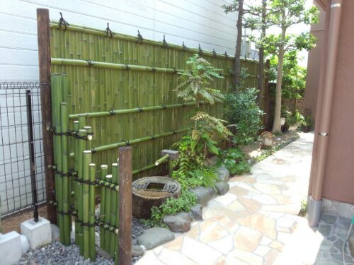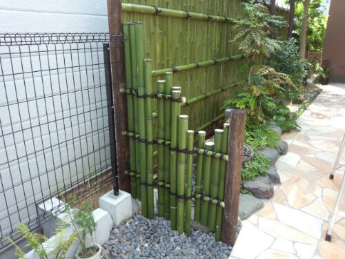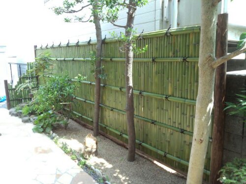 前回掲載した沼津市DI様邸の竹垣が完成しました。 建仁寺垣。 鉄砲垣。 鉄砲垣は、通常のつくりとは違い通路の圧迫感をなくすため通路側の柱を低くし、立子の高さをランダムにしました。青竹でつくる竹垣、やっぱり良いですね! 因みに、石積の方も現在施工中です。 完成までもうしばらくお待ち下さいm(_ _)m