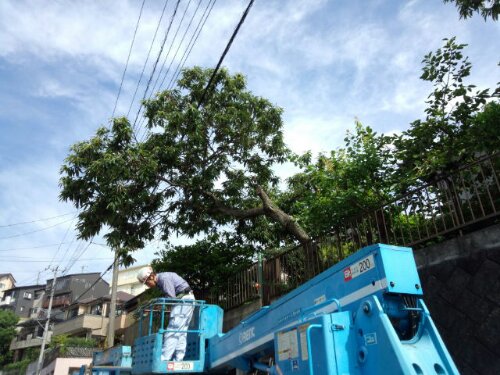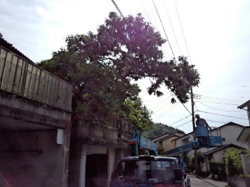 先日、三島市加茂にてクリノキの支障枝除去作業をおこないました。 作業前。 道路側に張り出してた枝を高所作業車に乗り切りました。 作業後。 枝が電線に絡んでたり、切る枝に蜂の巣があったりしましたが、無事完了しました。