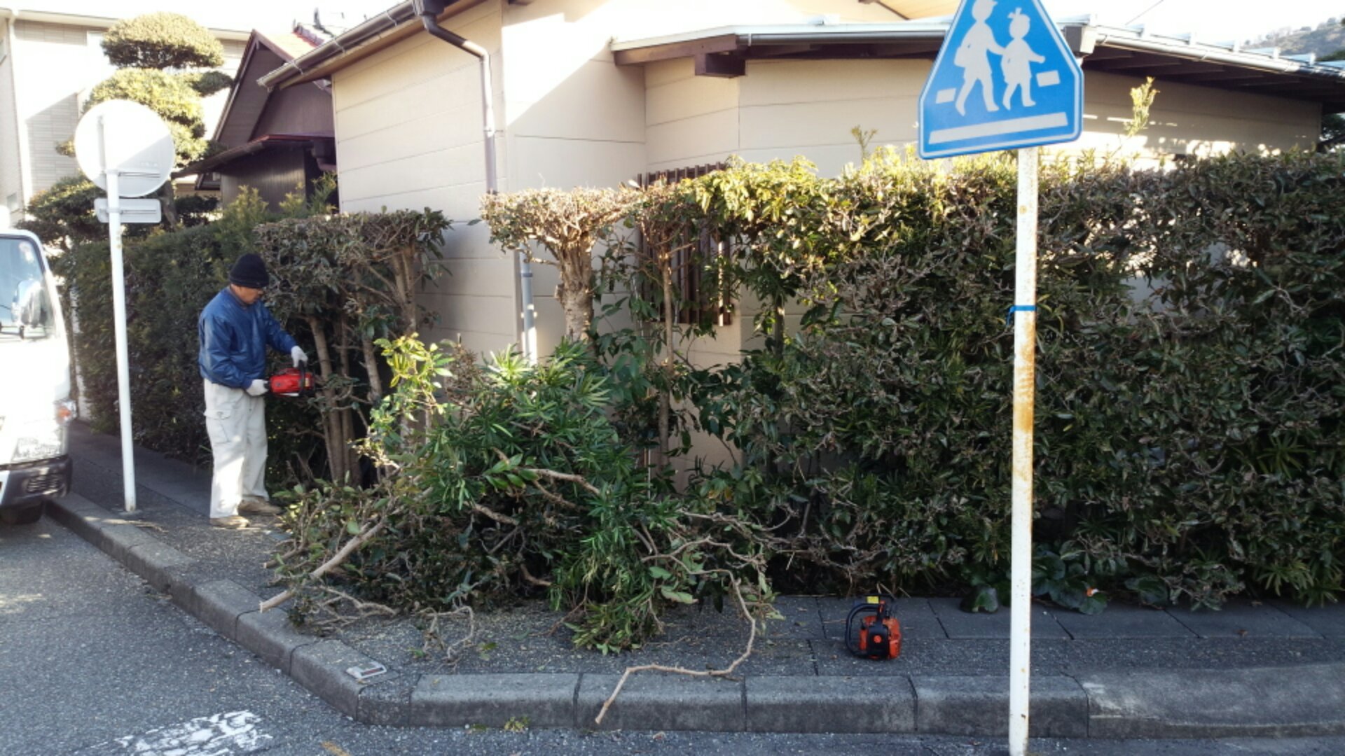 沼津市本郷町SI様邸にて生垣の伐採伐根作業をおこないました。