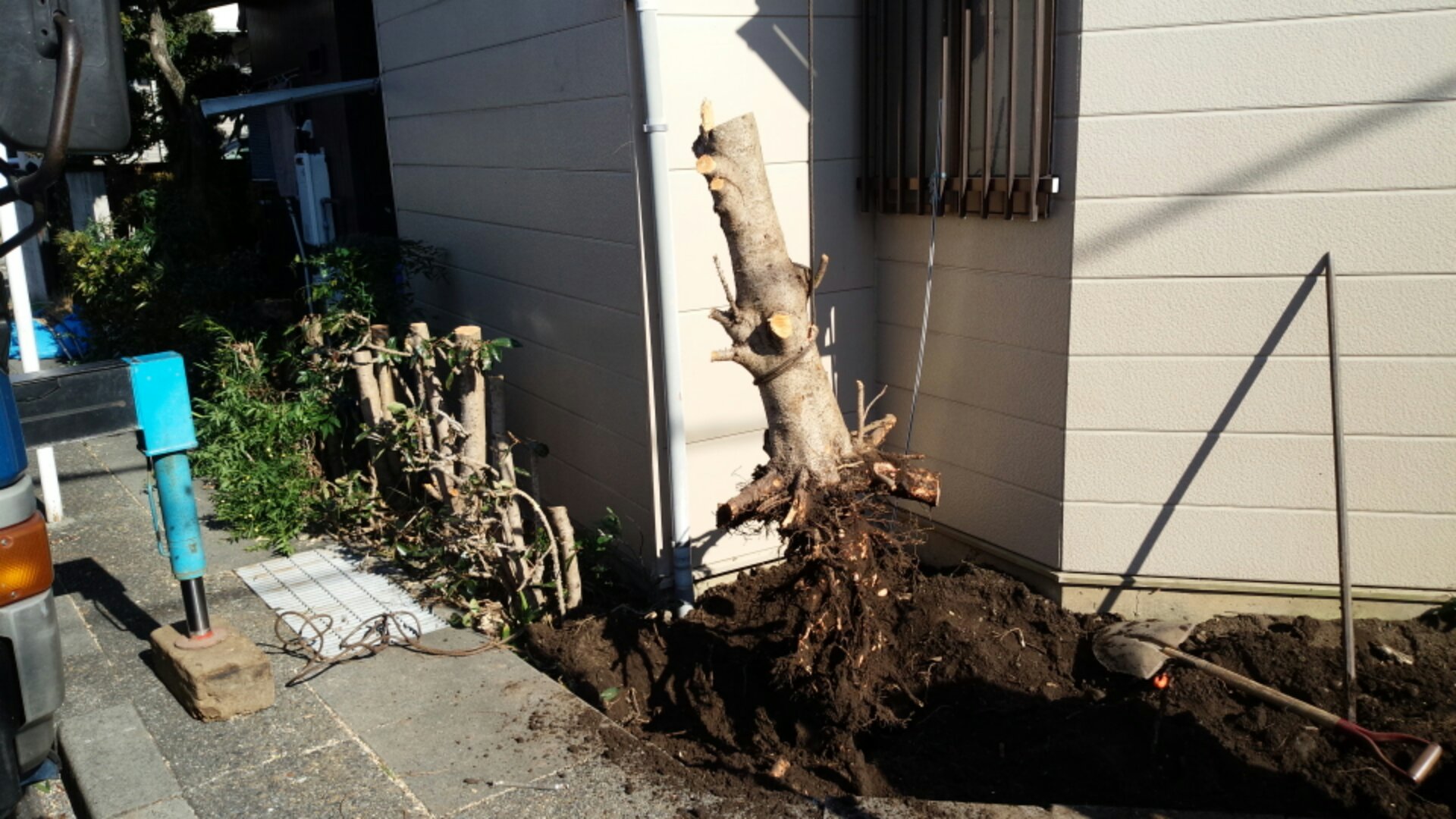 根を切りながらスコップで周りを掘り、グラグラしてきたところでユニックで引き抜きました。
