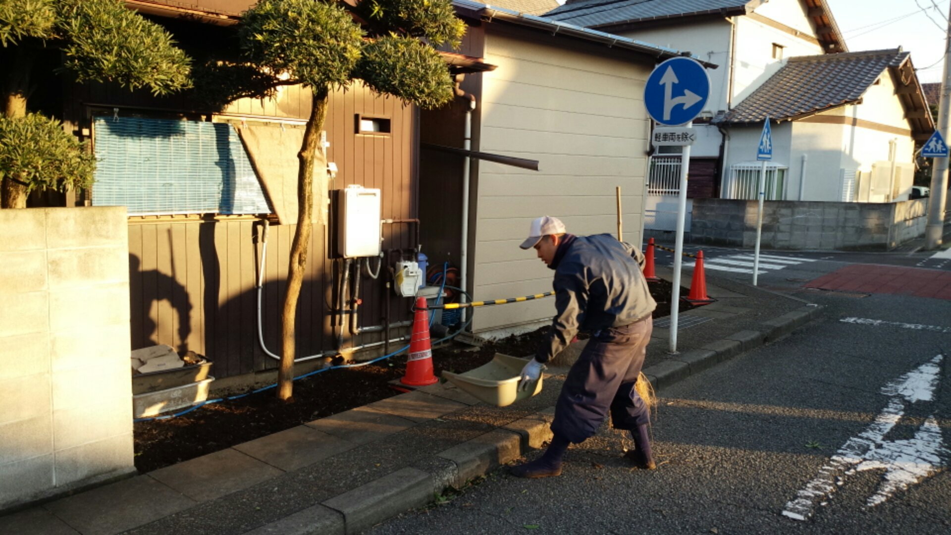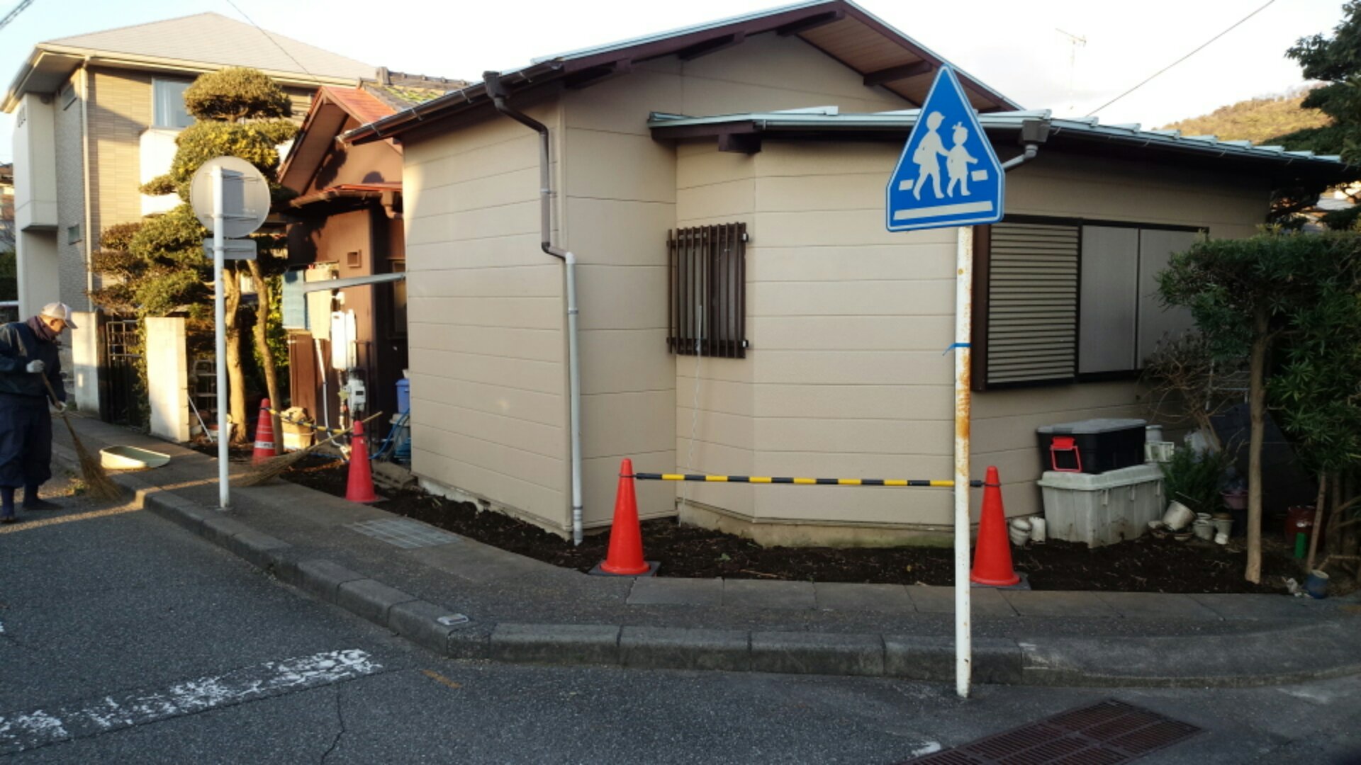 生垣、伐採,伐根作業終了。(牧野氏清掃中)