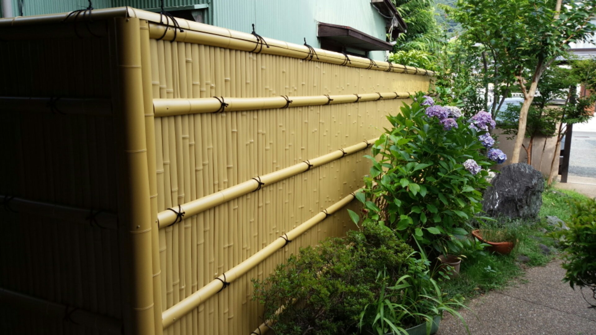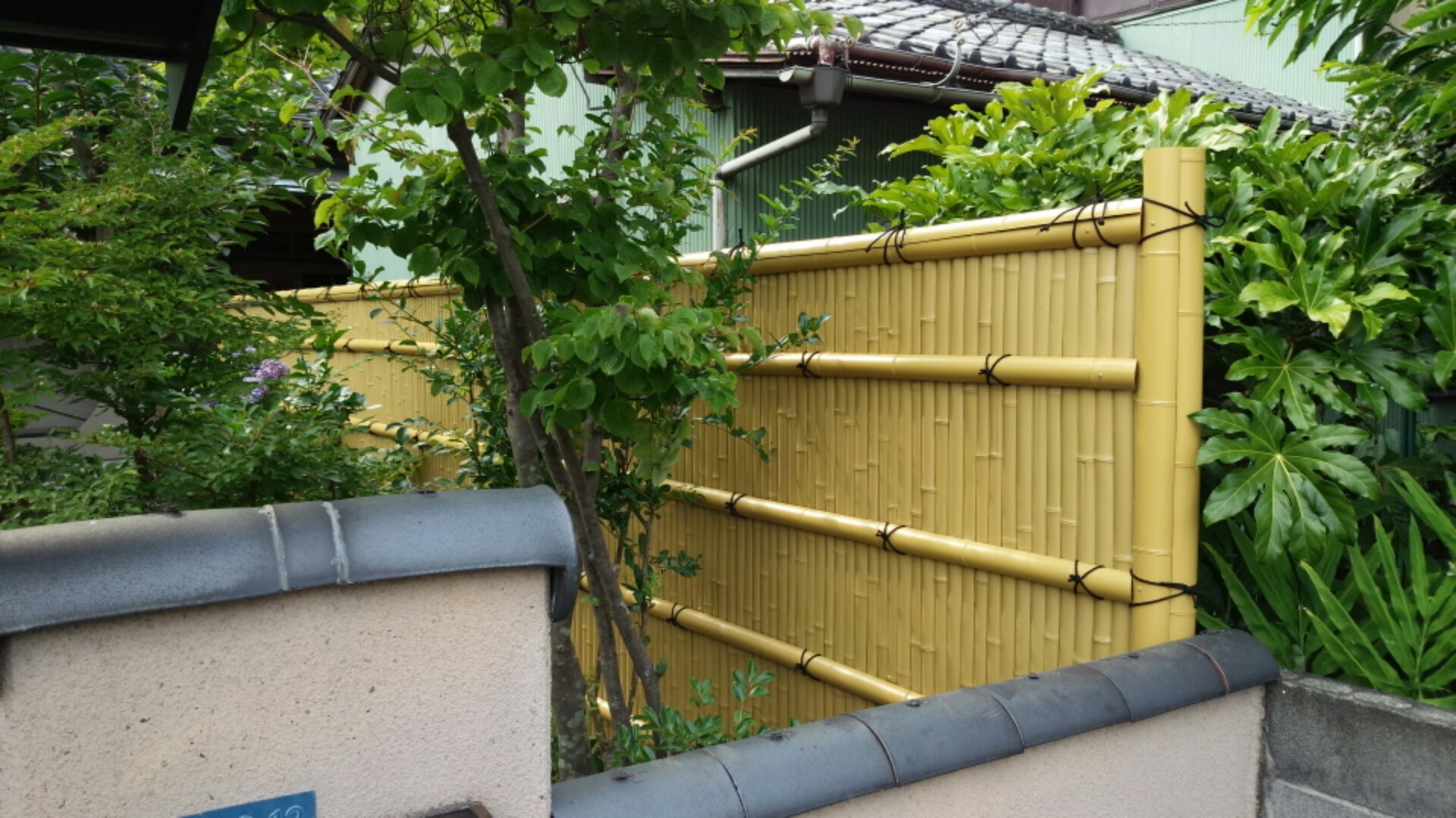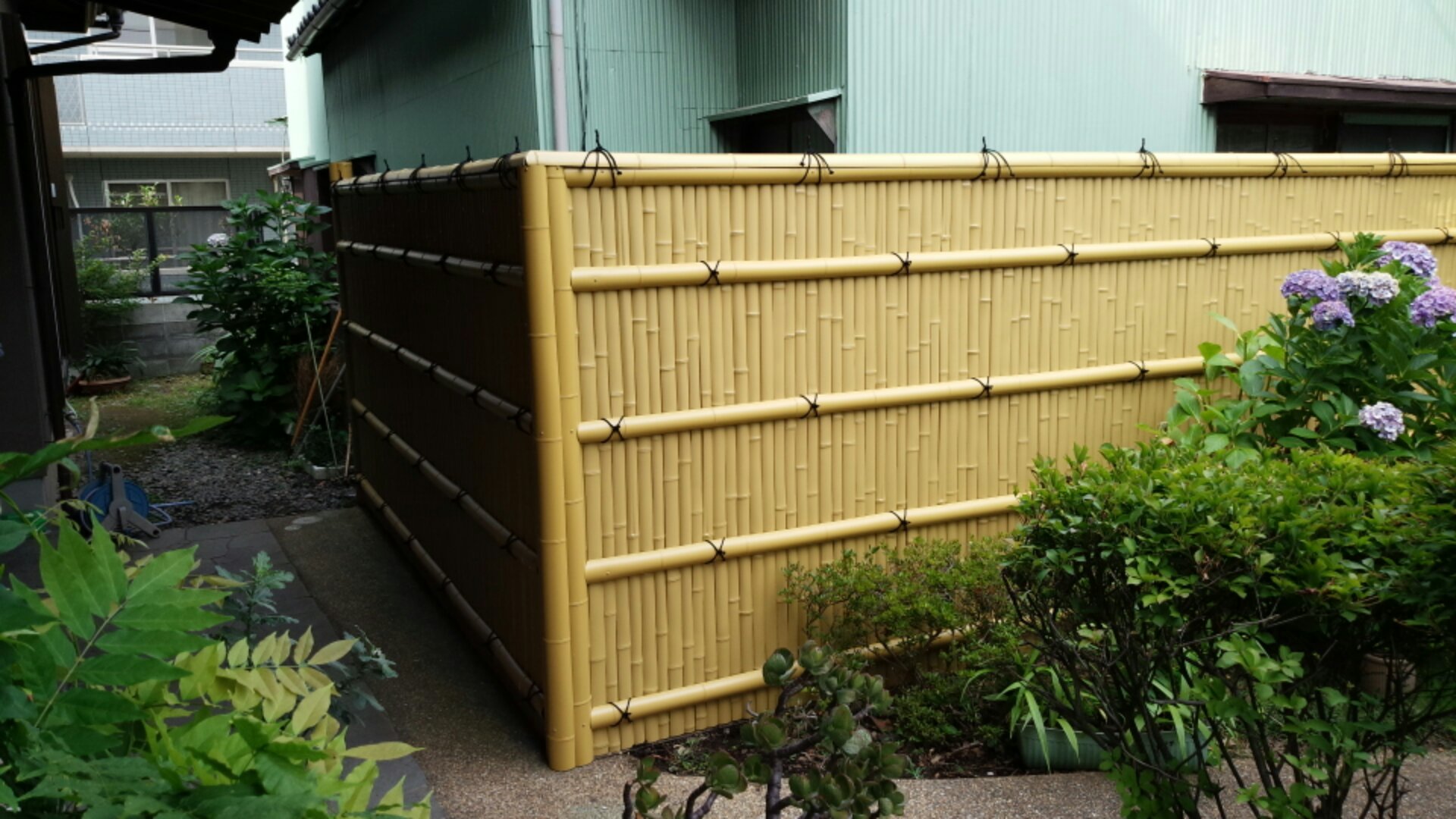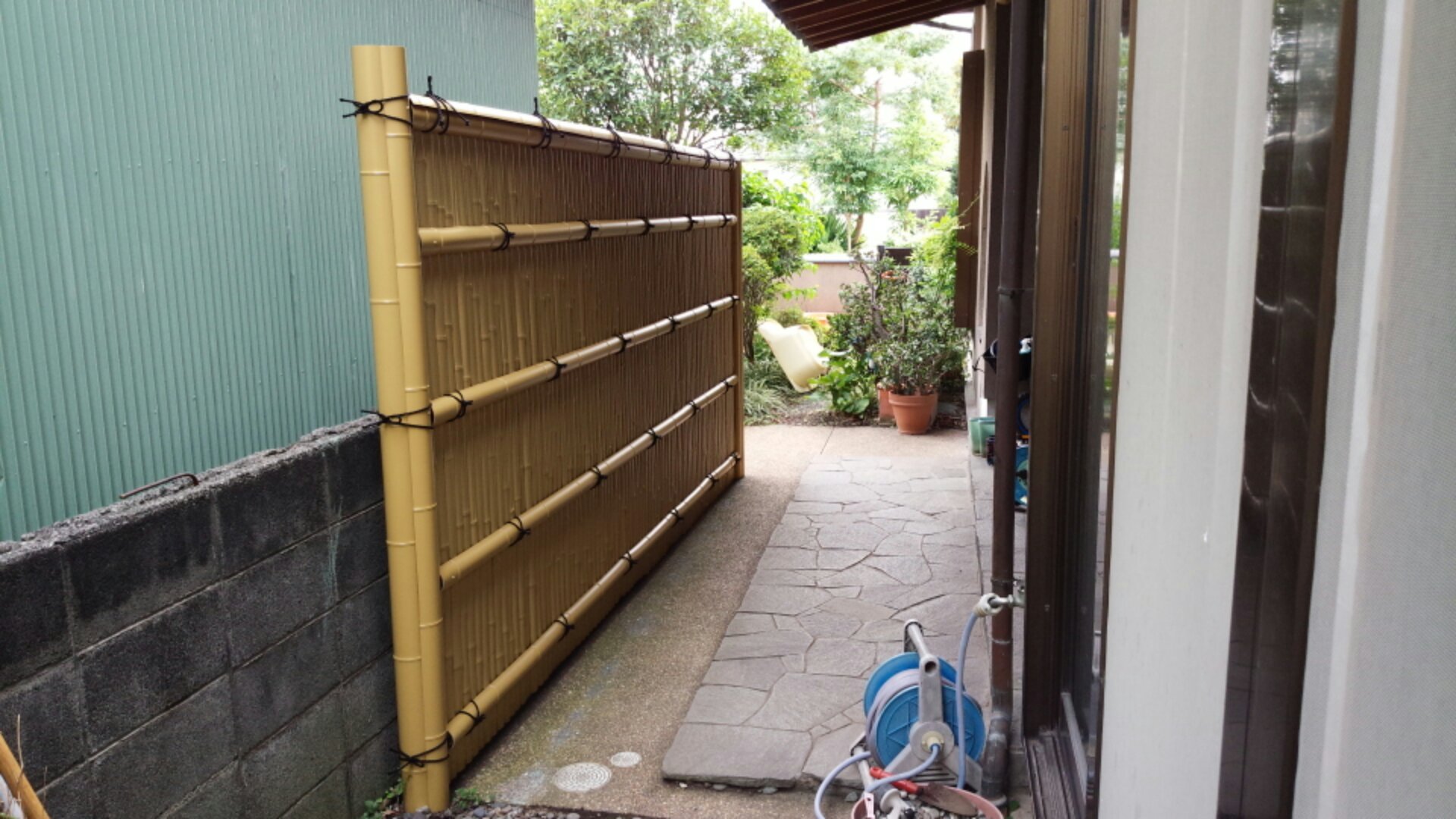 沼津市IE様邸にて竹垣の取り替えをおこないました。 もともと本物の建仁寺垣がありましたが年月がたち傷んだため、疑似建仁寺垣に交換となりました。 竹垣撤去後。 柱と胴縁は、アルミでできているためそのまま使用しました。 完成。