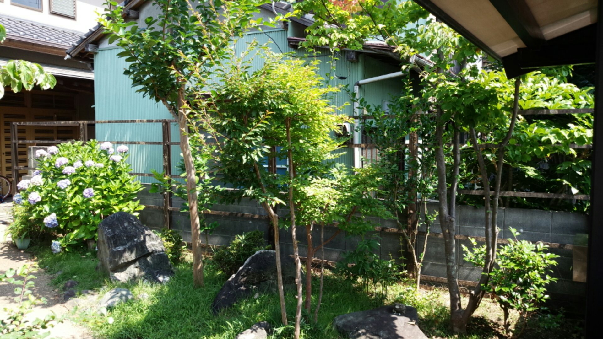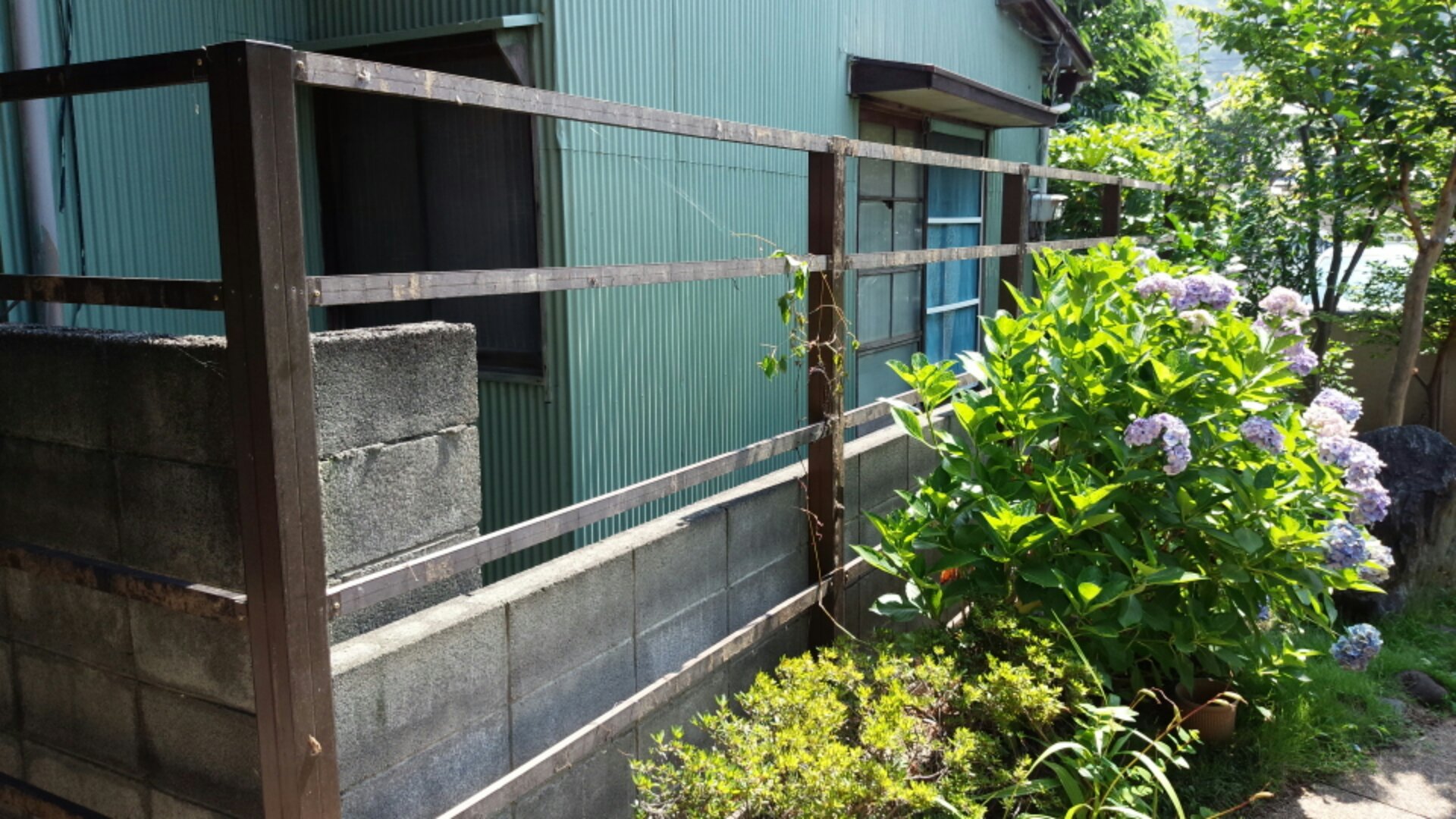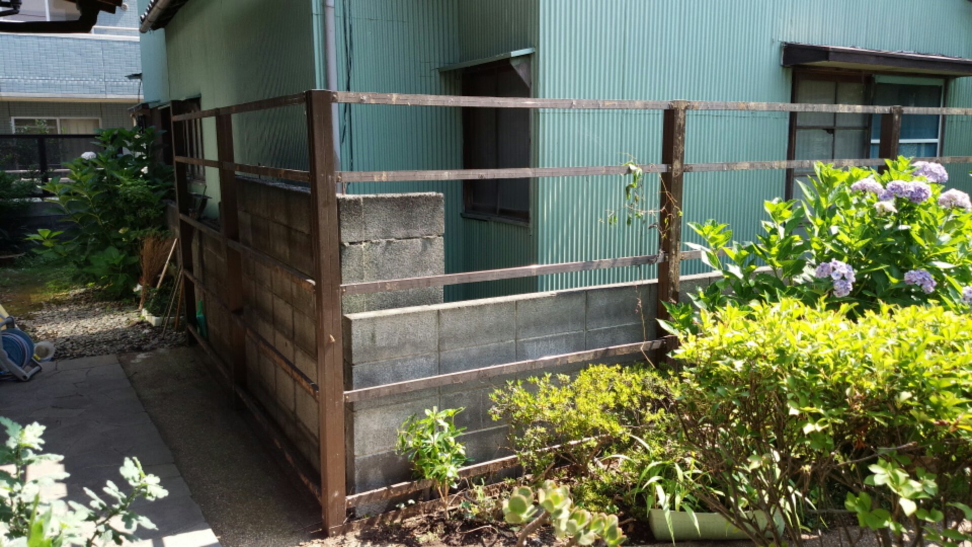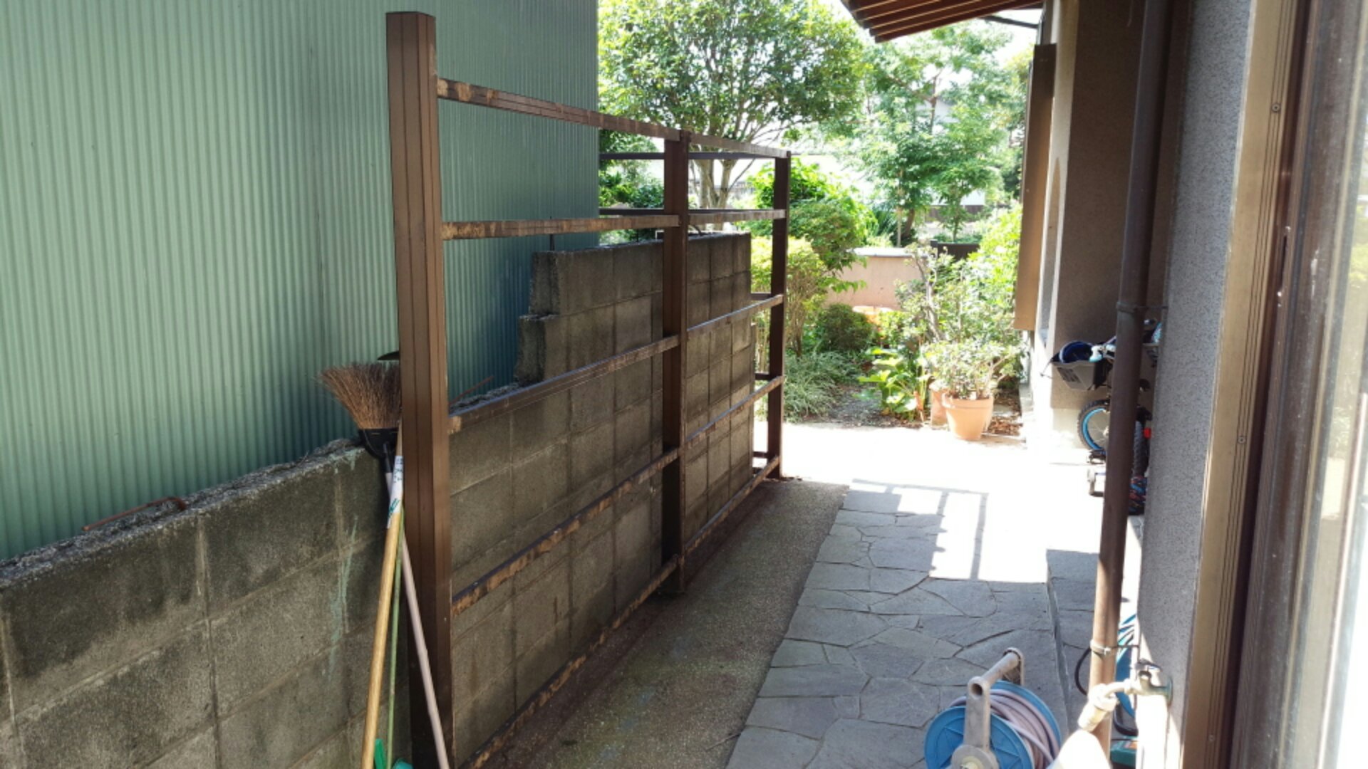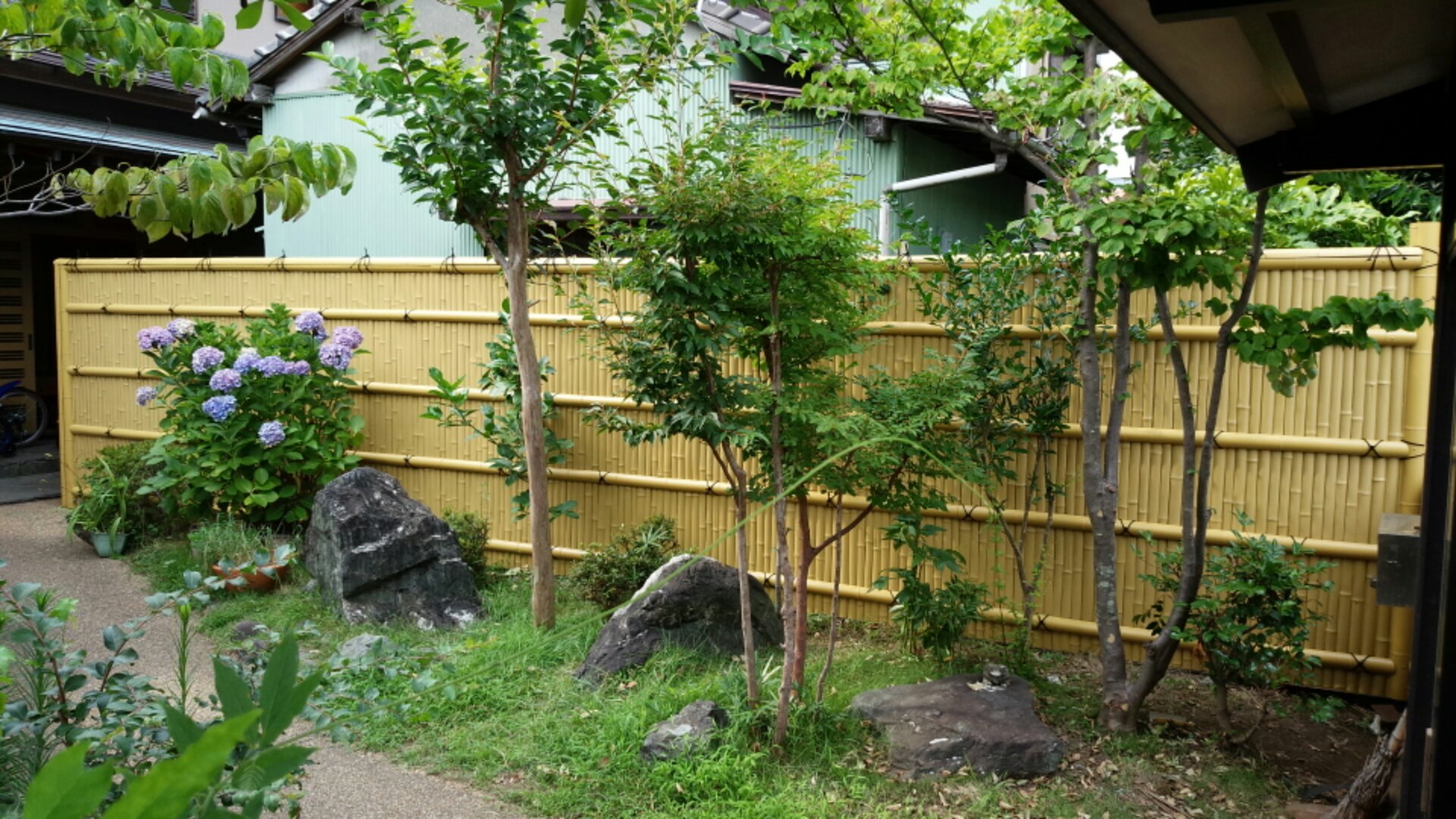 沼津市IE様邸にて竹垣の取り替えをおこないました。 もともと本物の建仁寺垣がありましたが年月がたち傷んだため、疑似建仁寺垣に交換となりました。 竹垣撤去後。 柱と胴縁は、アルミでできているためそのまま使用しました。 完成。