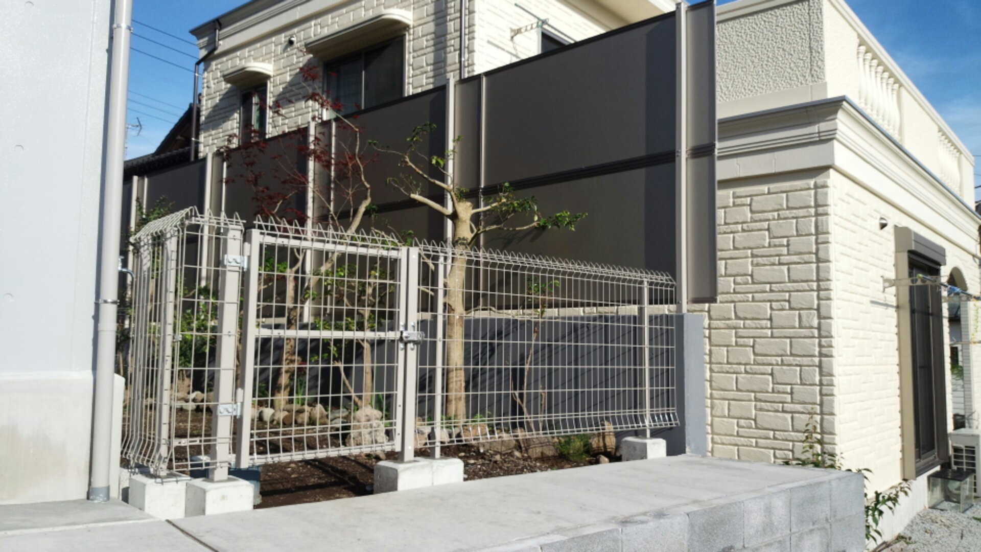 御殿場市にて、フェンス,サイクルポート,門扉,の施工と、樹木の移植の作業をおこないました。盛りだくさんの仕事内容でした! 2枚目の写真に写ってる遮蔽タイプのフェンスは、二段重ねになってるとゆうこともあり、柱は太く重量もあり埋め込みも通常のフェンスと比べ2倍以上埋め込みます。風当たり抜群ではありますが、向こう側がまったく見えないのでプライベートがしっかり守られます。