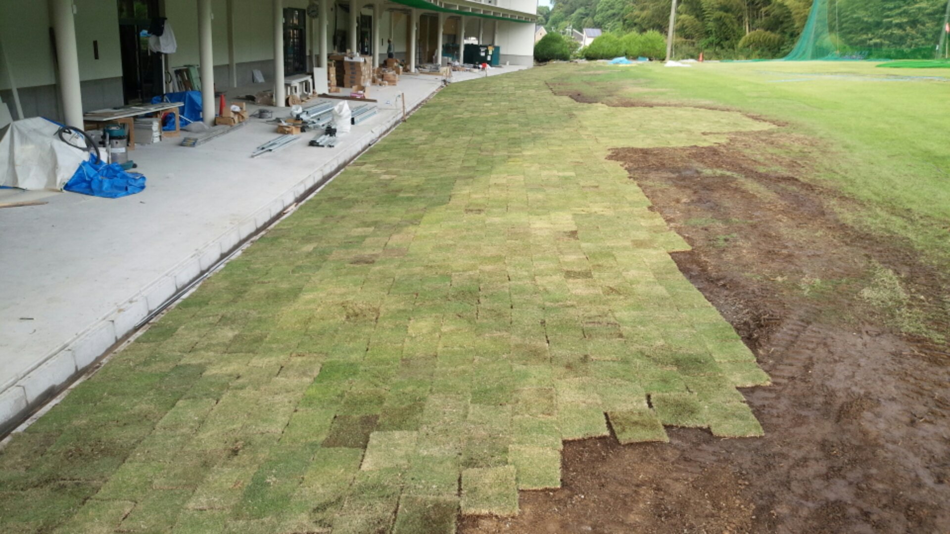先日、神奈川県小田原市にてゴルフ練習場の芝生の補修作業をおこないました。改修工事のため、一部芝生をはがしてあったのでその補修作業です。 全部で400束搬入しましたが、悪天候だったりもして中々の重労働でした^_^;