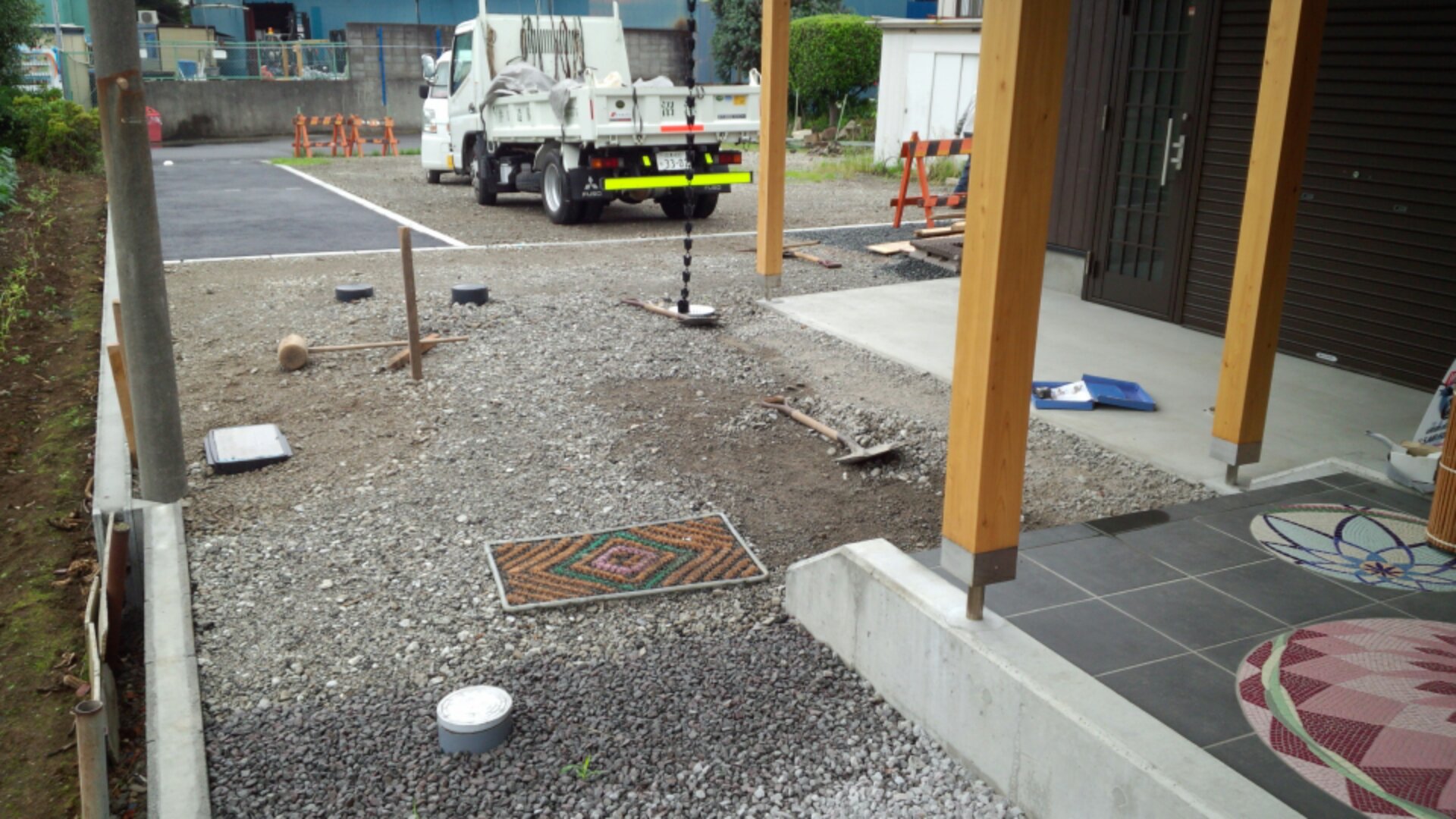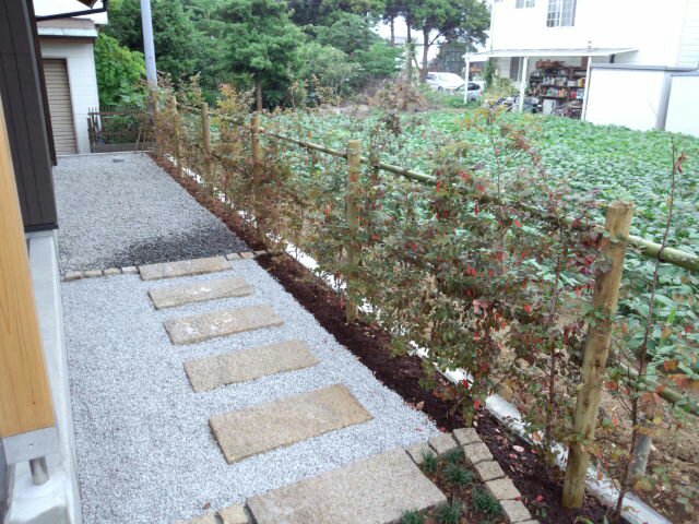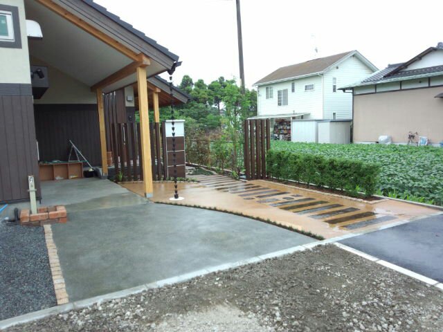 沼津市ID様邸の工事が完了しました!玄関前の工事をおこないました。作業前。 完成。左側の灰色の部分は、コンクリートの洗い出し仕上げになります。右側の茶色の部分は、枕木を敷いたまわりに土系舗装材で土の質感を出しました。垣根にキンメツゲを植栽しました。 左側のシルバーと木目調のものは、ポストになります。 奥の垣根にはトキワマンサクを植栽し、御影石の平板を飛び石に採用しました。