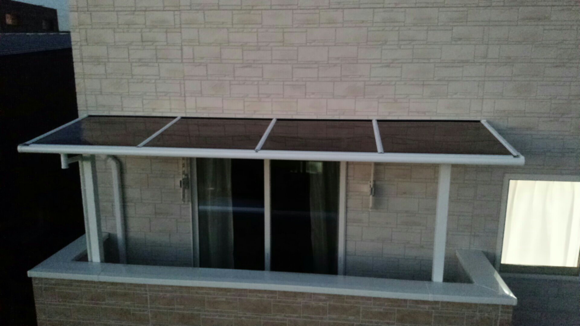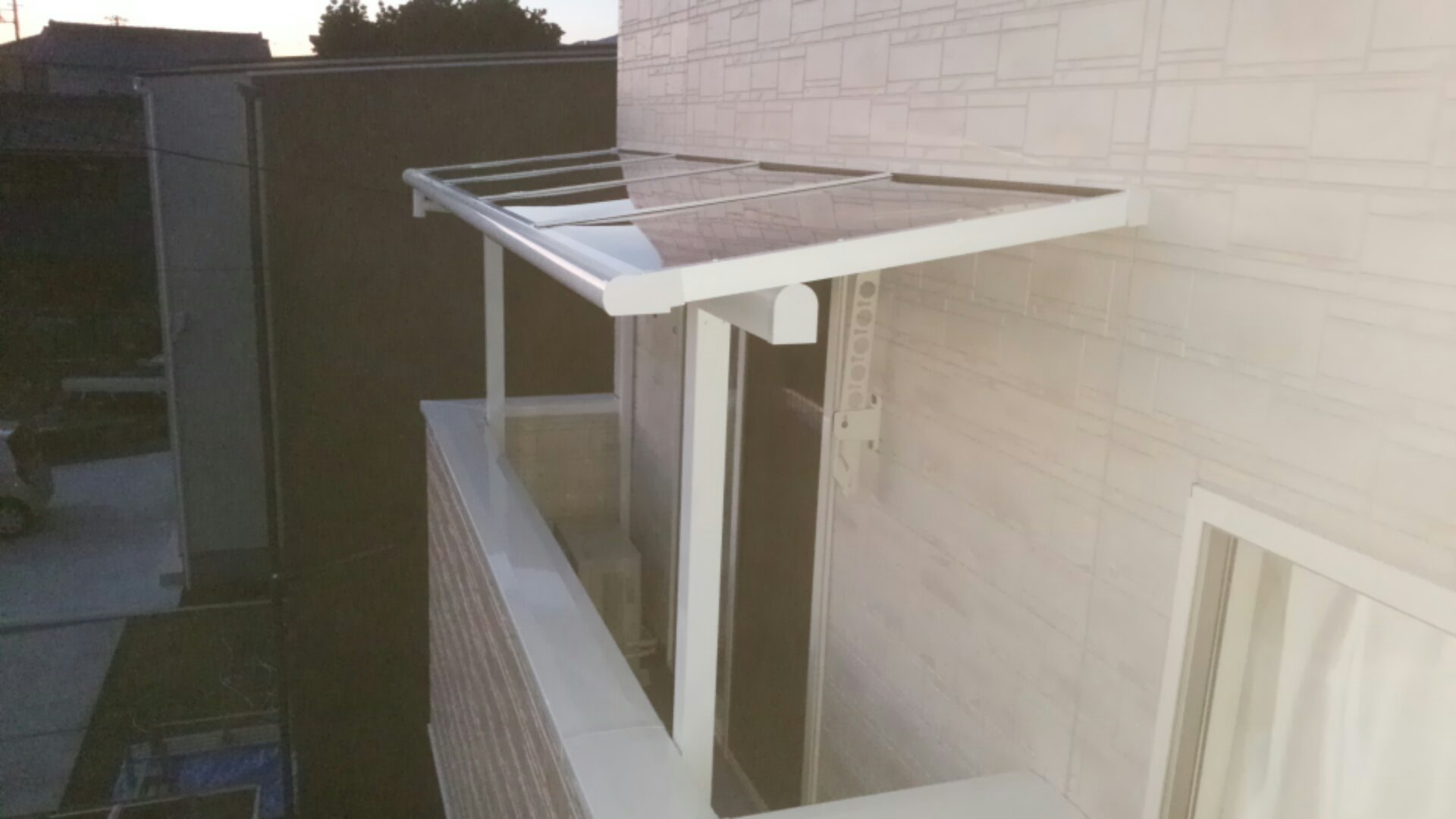テラスは二階ベランダに設置のため、ゴンドラを使用しての作業になりました。エクステリア専門業者さんでは中々ゴンドラや高所作業車を所有してる方はいないしわざわざレンタルして借りないと思うので造園屋の特権?だよなぁ、なんて思いました^_^;