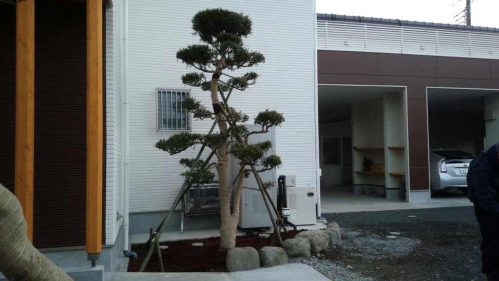 マツとマキは既存樹木で、新築工事に伴いいったん当社にてお預かりし再度移植しました。支柱も施工し風対策はバッチリです。