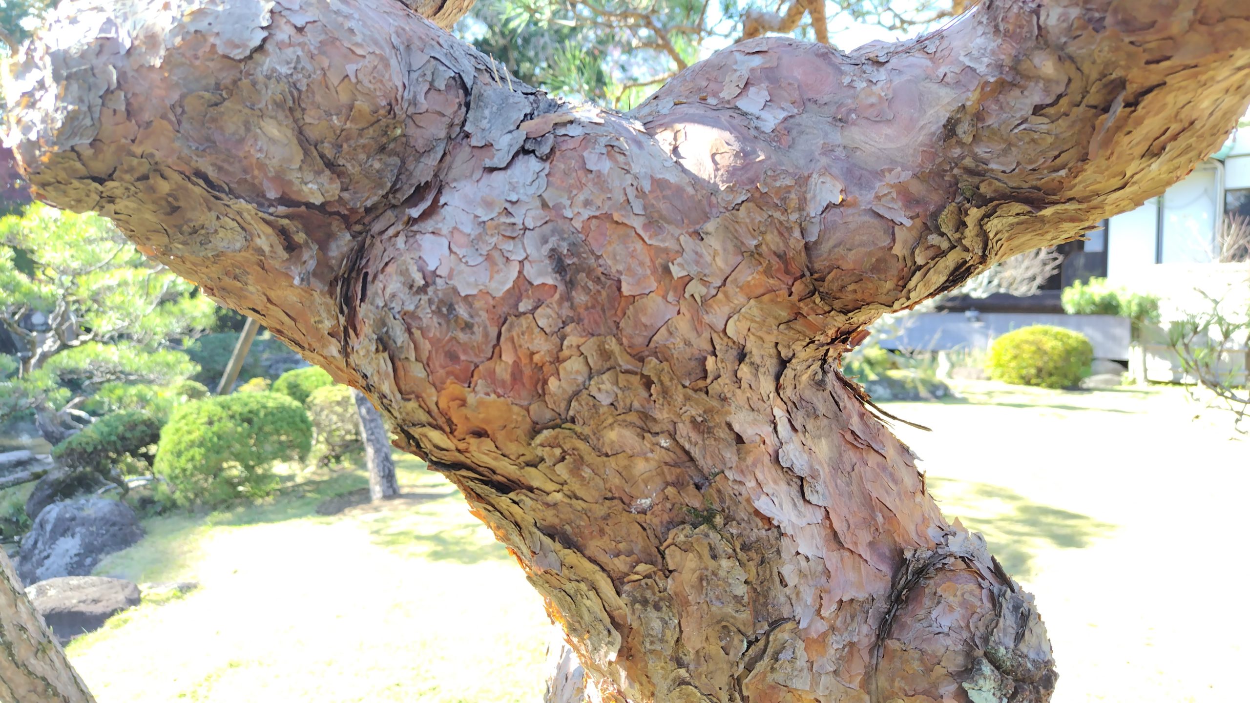 樹皮は赤みを帯び、成長すると亀甲状に割れる。