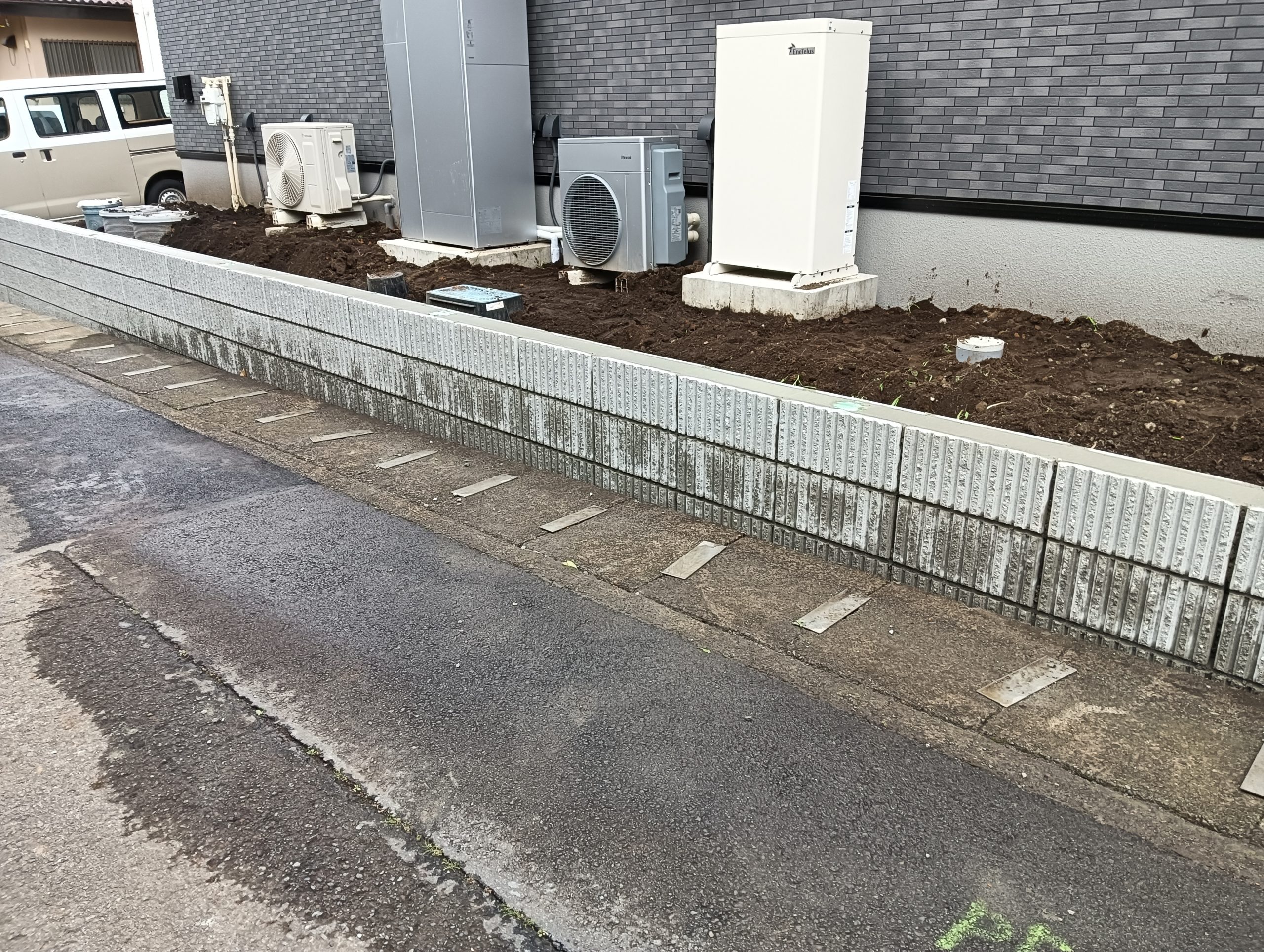 土留めを目的として、強度が必要な箇所だったので、150ミリの重量ブロックを積みました。