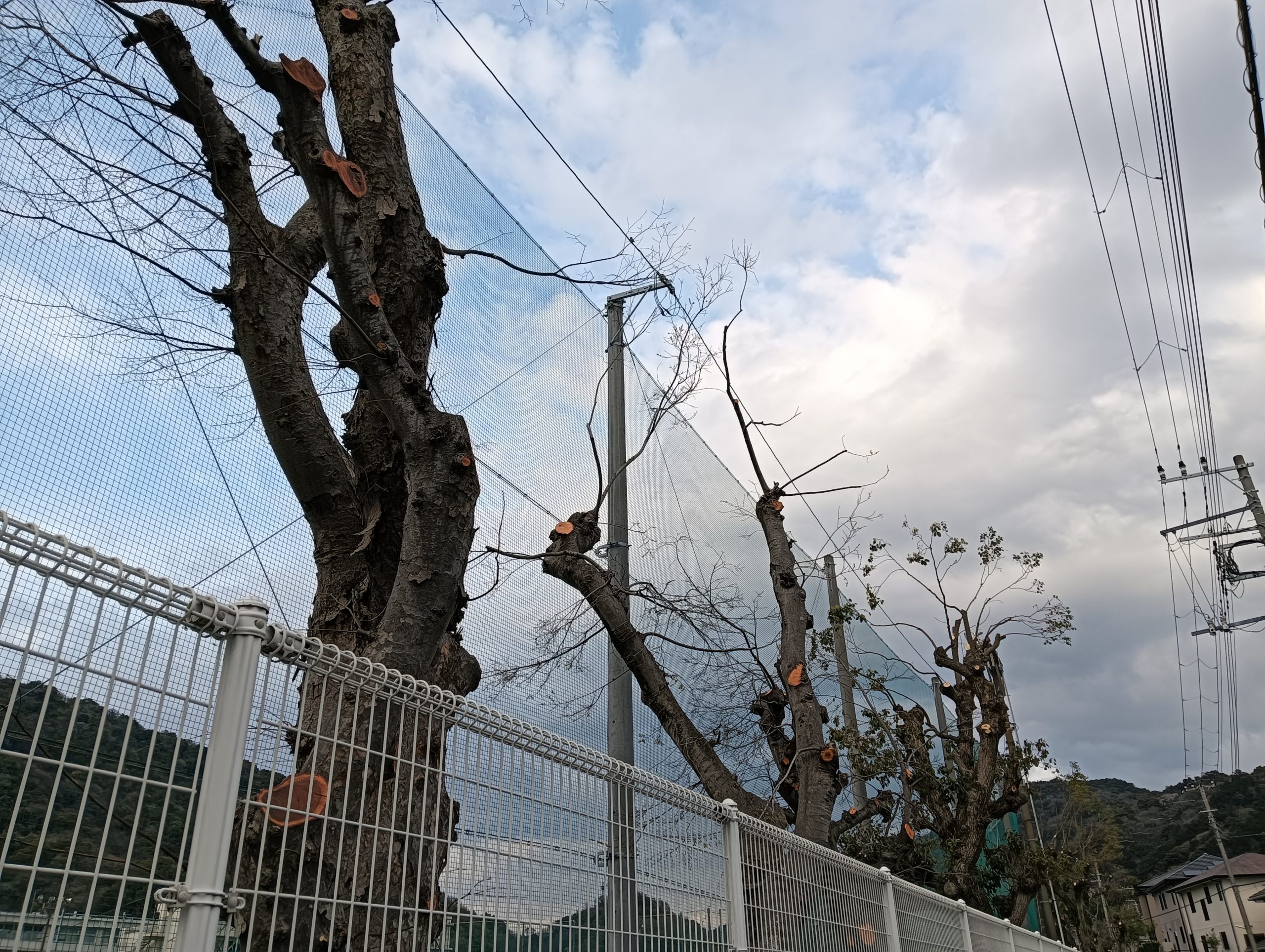 道路とグランドのネットに挟まれた場所だったので、左右の枝はすぐに支障枝になったしますので、強剪定で切り詰めました。