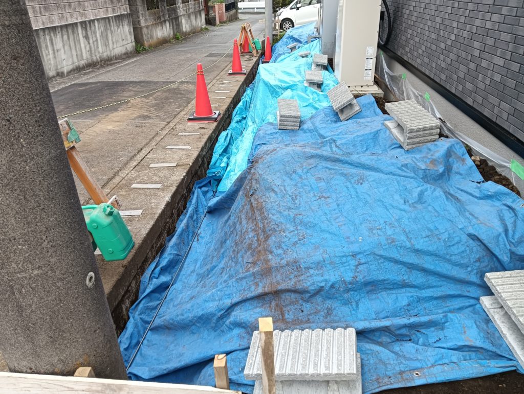 写真はシートをかけて見えませんが、道路沿いにブロックを積むため、床掘りをして、配筋をしてあります。