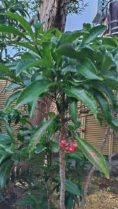 ●マンリョウ(Ardisia crenata Sims)サクラソウ科ヤブコウジ属 ・葉の形 長楕円形・葉のはえ方 互生・葉縁 鋸歯縁・花期 7~8月・両性花 ●真っ赤な果実と常緑の濃緑色の葉が魅力で、縁起の良い […]